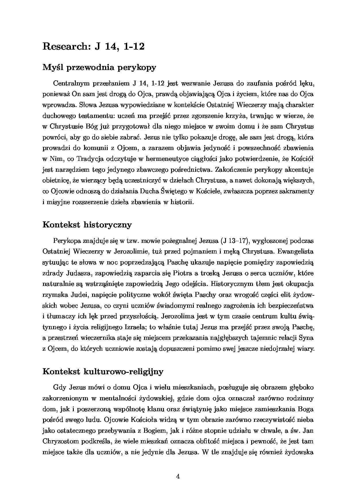 - Solidny research egzegetyczny, który zaoszczędzi Ci wielu godzin pracy – kontekst historyczny (rzymska okupacja Judei, napięcie polityczne wokół Paschy), kontekst kulturowo-religijny (żydowskie pojęcie „domu ojca”, logika przymierza, Namiot Spotkania i Świątynia jako tło), analiza filologiczna z greką (m.in. ταρασσέσθω – tarassestho, czyli to, że słowa Jezusa „niech się nie trwoży serce wasze” opisują nie zwykły lęk, ale głębokie wewnętrzne trzęsienie ziemi – to zdanie potrafi przemienić kazanie), omówienie tekstów paralelnych oraz niebezpiecznych anachronizmów, przez które współcześni wierni mogą nieświadomie zrozumieć tekst opacznie.